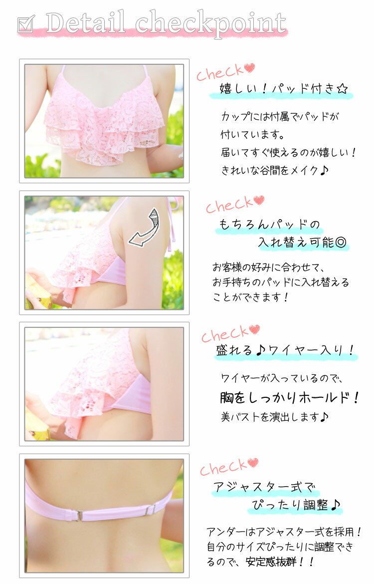 フレアにレースと、女の子らしさが凝縮されたデザインがとってもかわいい! ・イエロー 元気で活発な印象のイエロー 夏の日差しに光る明るいイエローレースで、可愛くセクシーに、女の子らしさを際立てます。