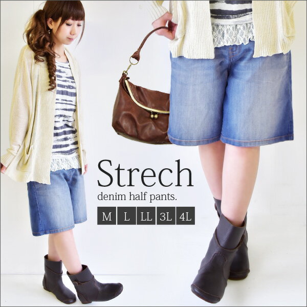 ベーシックストレッチデニムハーフパンツ●メール便不可●【M】【L】【LL】【3L】【4L】(デニム レディース ボトムス パンツ ミドル丈 ハーフ丈 ショーパン 膝丈 デニムパンツ ストレッチ 伸縮性 サイズ展開 大きいサイズ カジュアル ジーンズ デニムパンツ)