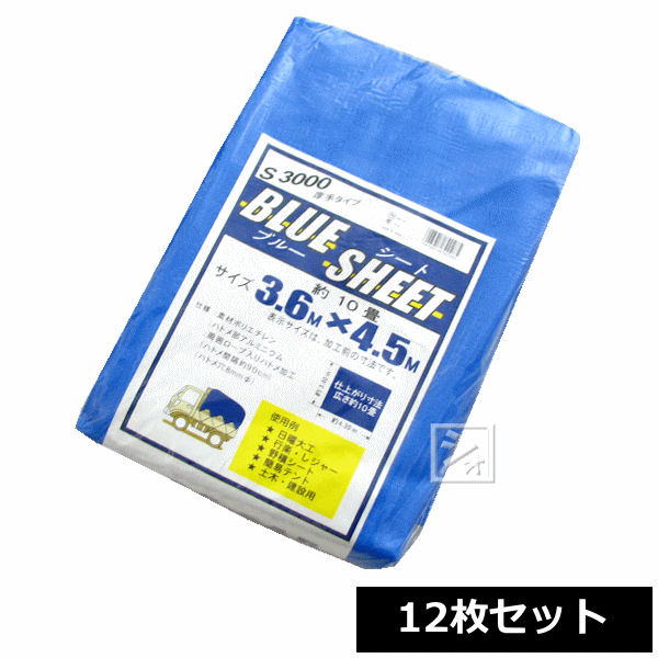 ブルーシート ビニールシート 厚手 #3000タイプ 建築・土木・野積み・養生等の多目的シート サイズ (3.6×4.5m) 12枚セット【厚手で丈夫な#3000番手!台風・地震等の災害・防災で大活躍】